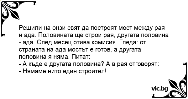 Решили на онзи свят да построят мост между рая и ада. Половината ще строи рая, другата половина- ада. След месец отива комисия. Гледа: от страната на ада мостът е готов, а другата половина я няма. Питат:
