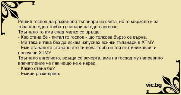 Тръгнало ангелчето, връща се вечерта, ама на господ му направило впечатление че пак нещо не е наред.