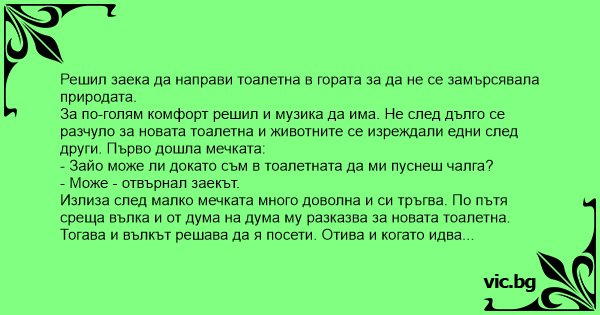 Влезнал той в тоалетната, а времето взело да лети. Минал половин час после цял, два и на третия излезнал. Като го видял заекът се уплашил и попитал: