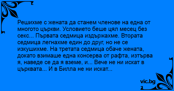 Решихме с жената да станем членове на една от многото църкви. Условието беше цял месец без cekc... Първата седмица издържахме. Втората седмица легнахме един до друг, но не се изкушихме. На третата седмица обаче жената, докато взимаше една консерва от рафта, изтърва я, наведе се да я вземе, и... Вече не ни искат в църквата... И в Билла не ни искат...