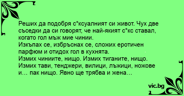 Реших да подобря сексуалният си живот. Чух две съседки да си говорят, че най-якият cekc ставал, когато гол мъж мие чинии.