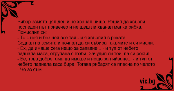 - Бе, това добре, ама да имаше и нещо за пийване... - и туп от небето паднала каса бира. Тогава рибарят се плесна по челото - Че аз съм хванал златната рибка бе да се eбa. в гъзa! - и оооп-оооп, понадигнал се той.