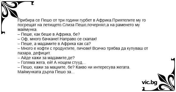 Прибира се Пешо от три години гурбет в Африка.Приятелите му го посрещат на летището.Слиза Пешо,почернял,а на раменето му маймунка.