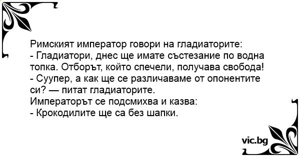 Římský císař promlouvá ke gladiátorům: „Gladiátoři, dneska budete mít zápas ve vodním pólu. Mužstvo, které vyhraje, dostane svobodu!” „A jak poznáme soupeře?” ptají se gladiátoři. Císař se...