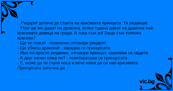 ...Рицарят дотича до стаята на красивата принцеса. Тя ридаеше: