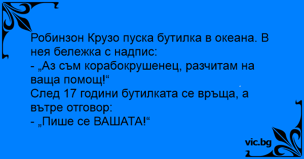 Робинзон Крузо пуска бутилка в океана. В нея бележка с надпис: