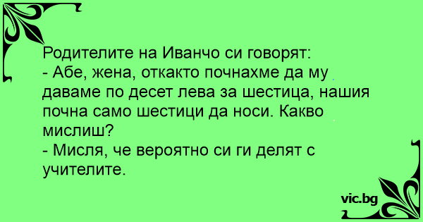 - Абе, жена, откакто почнахме да му даваме по десет лева за шестица, нашия почна само шестици да носи. Какво мислиш?