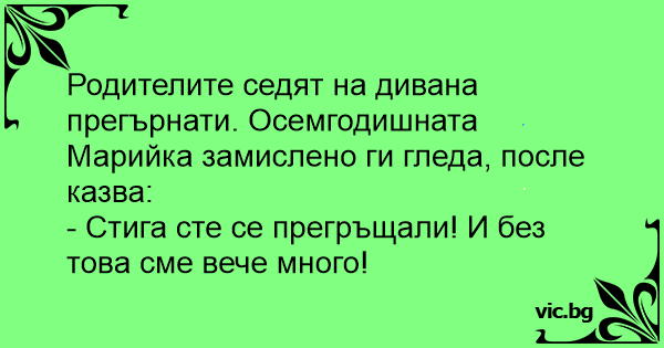 Родителите седят на дивана прегърнати. Осемгодишната Марийка замислено ги гледа, после казва: