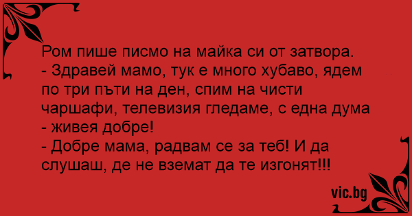 - Здравей мамо, тук е много хубаво, ядем по три пъти на ден, спим на чисти чаршафи, телевизия гледаме, с една дума - живея добре!