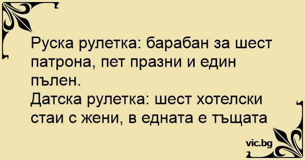 Zambian Roulette Турска, френска, индийска, американски рулетки Η ρωσική ρουλέτα... Видове руска рулетка: O embaixador americano conversava com um diplomata africano que elogiava os russos: — Eles construíram uma hidroelétrica, um aeroporto, um estádio, ensinaram-nos a beber vodka e jogar roleta russa.... Een Afrikaanse ambassadeur van een klein Afrikaans landje gaat op bezoek in Rusland. Hij wordt daar natuurlijk opgevangen door zijn gelijke: een Russische ambassadeur. Die verwent hem een week lang... The ambassador of a small African nation chanced to visit Russia, and was entertained by his opposite number, the Russian ambassador. For three days, the African ambassador was wined, dined, and... Russisk roulette: seks kamre i pistolen, én patron. Afrikansk roulette: seks hytter med afroditter med munden klar, den ene er kannibal. Dansk roulette: seks hotelværelser med villige damer, den... L’ambassadeur français d’un pays africain a été invité chez un diplomate du cru. Tous les deux discutent des récents progrès réalisés dans le pays ces dernières années, alors que les russes étaient... Un tip se rataceste prin jungla africana, si la un moment dat este capturat de canibali. Seful tribului ii da o sansa de scapare: - Daca vrei sa traiesti trebuie sa treci o proba! - Orice numai nu... Un european ajunge la un trib izolat din Africa si seful de Trib il ia sa-i arate atractiile locale. intr-o vale, mai la dos, Era un scaun turnant, imprejurul caruia stateau pe pamint Sase negrese... - Vet du vad afrikansk roulette är? - Ja, du sitter i en kolsvart hydda med sex mörkhyade brudar som ska suga av dig, men en av dem är kannibal. Ο πρέσβης της Ρωσίας σε κάποιο Αφρικανικό κράτος και ένας ντόπιος διπλωμάτης συζητάνε για την τεχνογνωσία που το κράτος είχε πάρει από τη Ρωσία. "Εργοστάσια, δρόμοι, αεροδρόμιο και Ρώσικη ρουλέτα"...