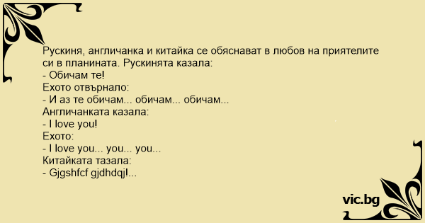 Рускиня, англичанка и китайка се обяснават в любов на приятелите си в планината. Рускинята казала: