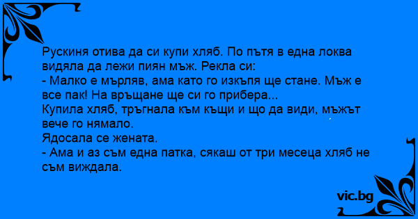 Рускиня отива да си купи хляб. По пътя в една локва видяла да лежи пиян мъж. Рекла си: