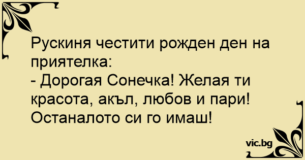 - Дорогая Сонечка! Желая ти красота, акъл, любов и пари! Останалото си го имаш!