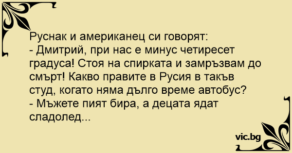 - Дмитрий, при нас е минус четиресет градуса! Стоя на спирката и замръзвам до смърт! Какво правите в Русия в такъв студ, когато няма дълго време автобус?