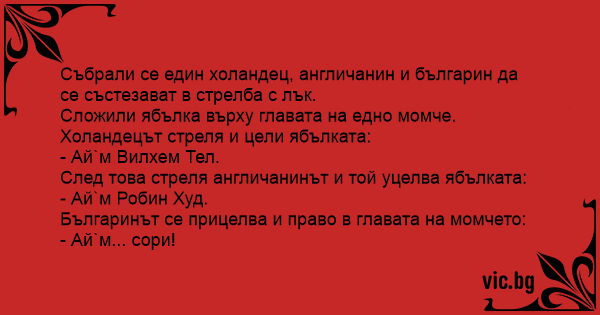 Nella foresta di Sherwood viene organizzata una gara di tiro con l’arco. Arriva il primo concorrente, chiama un bambino e gli dice: “Bambino, prendi questa mela, vai a 50 metri e mettitela in... Um brasileiro e um argentino foram para a inglaterra, e lá conheciam um inglês. Na inglaterra, como tem muita competição de arco e flecha eles entraram.Primeiro foi o inglês colocou a maçã em cima... Ein Schweizer, ein Engländer und ein Amerikaner nehmen im Wald einen Jungen gefangen, den sie an einen Baum fesseln. James Bond, Robin des Bois et Rambo font un concours de tir. Ils prennent un passant sur leur chemin, le plaquent contre un arbre et lui flanquent une pomme sur la tête. Concours de tir à l'arc. A 50m, un mec debout contre un arbre, une pomme sur la tête, sert de cible. Le premier tireur se positionne. Il vise, tire: tchac! en plein dans la pomme. Le gars regarde la foule: Αγώνας Τοξοβολίας. Οι αγώνες τοξοβολίας.. Tre sportivi, uno Inglese, uno Spagnolo e un Italiano, si sfidano in una sfida di precisione nel tiro ad'arco per centrare la mela posizionata sulla testa. L'Inglese mira e colpisce la mela e dice:... Έγινε κάποτε ένας διαγωνισμός τοξοβολίας στον οποίο έχουν φτάσει στον τελικό ένας Άγγλος, ένας Γερμανός και ένας Πόντιος. Ο στόχος ήταν να πετύχουν ένα μήλο το οποίο ήταν πάνω στο κεφάλι ενός... Anglija, 16. Gs. notiek loka šaušanas sacensības. Mērķis ir cilvēks ar ābolu uz galvas. Atnāk viens džeks. Nomērķē, šauj un trāpa ābolam tieši pa vidu. Viņš pagriežas pret pūli, kas vēro sacensības... Šaudymo iš lanko varžybos. Išeina šveicaras su lanku, pasikviečia vieną žmogelį iš minios, duoda jam obuolį, pasako nueiti už šimto metrų ir užsidėti obuolį ant galvos. Žmogelis nueina, atsistoja... Están en un concurso de arqueros... Entonces sale uno 100 metros una manzana, la lanza.. fun. en el centro y dice: - I am ROBIN HOOD Sale otro 200 metros una manzana la lanza y Fun al centro -y...