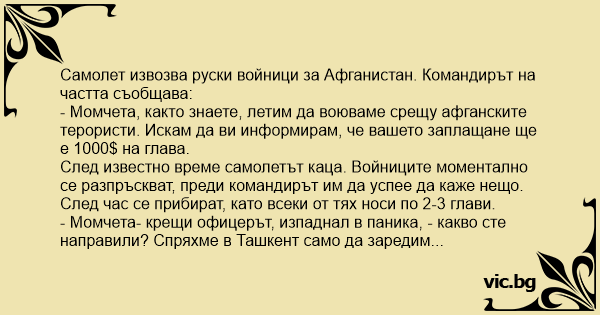 Самолет извозва руски войници за Афганистан. Командирът на частта съобщава: - Момчета, както знаете, летим да воюваме срещу афганските терористи. Искам да ви информирам, че вашето заплащане ще е 1000$ на глава. След известно време самолетът каца. Войниците моментално се разпръскват, преди командирът им да успее да каже нещо. След час се прибират, като всеки от тях носи по 2-3 глави. - Момчета- крещи офицерът, изпаднал в паника, - какво сте направили? Спряхме в Ташкент само да заредим...