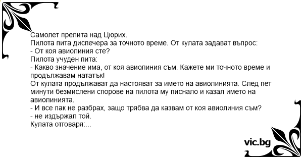 От кулата продължават да настояват за името на авиолинията. След пет минути безмислени спорове на пилота му писнало и казал името на авиолинията.