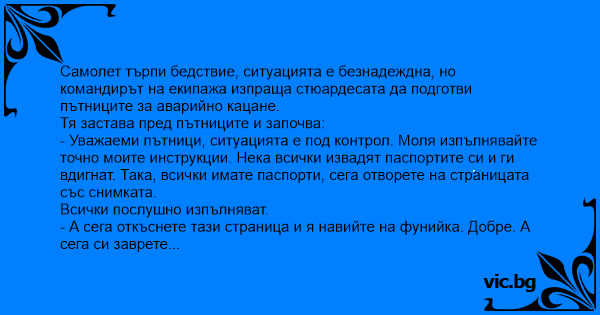 Ανακοίνωση αεροσυνοδού λίγο πριν την πτήση: - Κυρίες και κύριοι, δεθείτε καλά και σας διαβεβαιώνουμε ότι θα κάνουμε ότι μπορούμε για να έχετε ευχάριστο ταξίδι. Πάντως βάλτε το διαβατήριό σας ο...