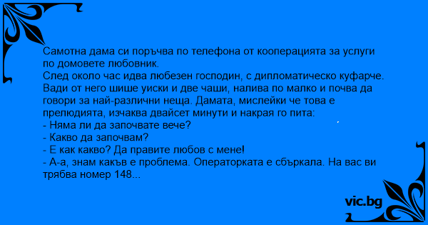 Самотна дама си поръчва по телефона от кооперацията за услуги по домовете любовник.