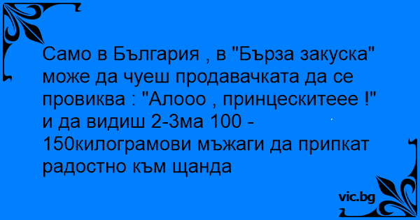 Само в България , в "Бърза закуска" може да чуеш продавачката да се провиква : "Алооо , принцескитеее !" и да видиш 2-3ма 100 -150килограмови мъжаги да припкат радостно към щанда