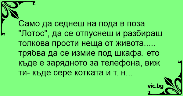 Само да седнеш на пода в поза "Лотос", да се отпуснеш и разбираш толкова прости неща от живота..... трябва да се измие под шкафа, ето къде е зарядното за телефона, виж ти- къде сере котката и т. н...