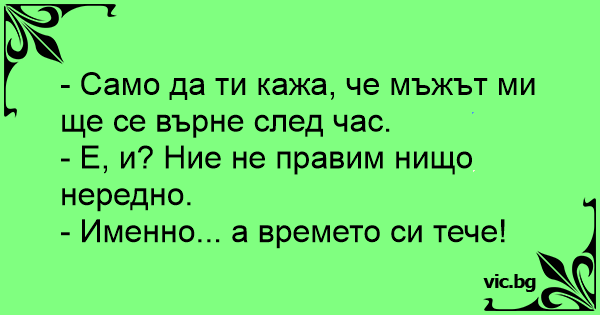 Двоє у кімнаті. вона: - Між іншим, мій чоловік повернеться через годину! - Ну то й що, ми ж не робимо нічого поганого. - Саме так! А час-то йде!