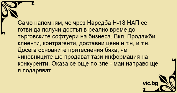 Само напомням, че чрез Наредба Н-18 НАП се готви да получи достъп в реално време до търговските софтуери на бизнеса. Вкл. Продажби, клиенти, контрагенти, доставни цени и т.н, и т.н.