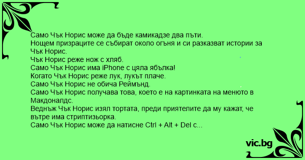 Веднъж Чък Норис изял тортата, преди приятелите да му кажат, че вътре има стриптизьорка.