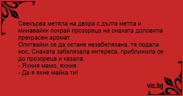 Свекърва метяла на двора с дълга метла и минавайки покрай прозореца на снахата доловила прекрасен аромат.
