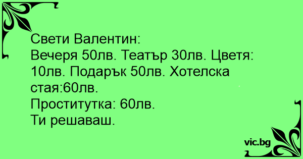 Вечеря 50лв. Театър 30лв. Цветя: 10лв. Подарък 50лв. Хотелска стая:60лв.