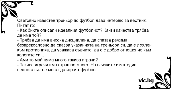 Световно известен треньор по футбол дава интервю за вестник.