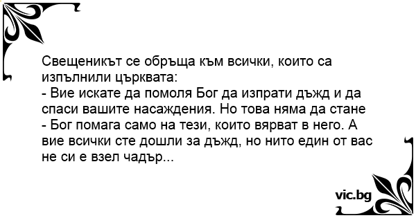 - Вие искате да помоля Бог да изпрати дъжд и да спаси вашите насаждения. Но това няма да стане - Бог помага само на тези, които вярват в него. А вие всички сте дошли за дъжд, но нито един от вас не си е взел чадър...
