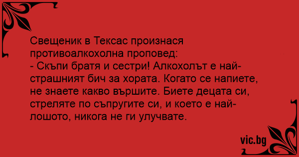 - Скъпи братя и сестри! Алкохолът е най-страшният бич за хората. Когато се напиете, не знаете какво вършите. Биете децата си, стреляте по съпругите си, и което е най-лошото, никога не ги улучвате.