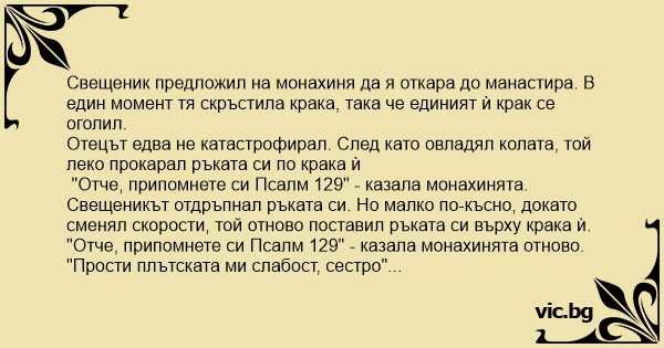 "Отче, припомнете си Псалм 129" - казала монахинята. Свещеникът отдръпнал ръката си. Но малко по-късно, докато сменял скорости, той отново поставил ръката си върху крака ѝ.