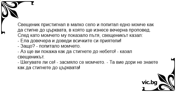 Свещеник пристигнал в малко село и попитал едно момче как да стигне до църквата, в която ще изнесе вечерна проповед. След като момчето му показало пътя, свещеникът казал: