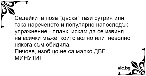 Седейки в поза "дъска" тази сутрин или така нареченото и популярно напоследък упражнение - планк, искам да се извиня на всички мъже, които волно или неволно някога съм обидила.