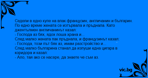 Седели в едно купе на влак французин, англичанин и българин.