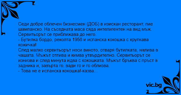 След малко сервитьорът носи виното, отваря бутилката, налива в чашата. Мъжът отпива и кимва утвърдително. Сервитьорът се изнизва и след минута идва с кокошката. Мъжът бръква с пръст в задника и, завърта го, вади го и го облизва.