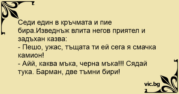 Седи един в кръчмата и пие бира.Изведнъж влита негов приятел и задъхан казва: