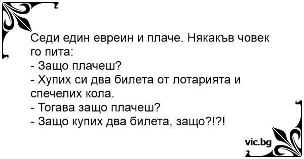 Седи на улицата един евреин и плаче. Минава друг евреин и го пита: