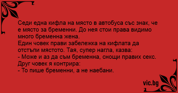 Седи една кифла на място в автобуса със знак, че е място за бременни. До нея стои права видимо много бременна жена.