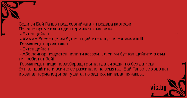 - Бе кво ще товариш бе виж че тоя ми бутна щайгите! - отговорил Бай Ганьо.