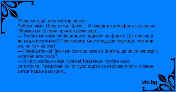 — Трябва ми тема за финалните надписи на филма. Ще праснеш ли нещо простичко? Премиерата ми е след две седмици, помогни ми, че съм на зор!