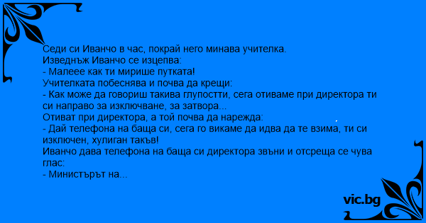 Учителката пита: - Деца, кое цвете мирише най-много? Марийка: - Розата, госпожо. - Браво Марийке и аз я харесвам. Петя: - Люляка. Гошко: - Гергината. Иванчо нетърпеливо: - Най-мирише пу*ката на госпожа Петрова. Иванчо го води учителката при директора и разплакана обяснява ,как са я обидили....
