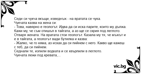 Чукчата лежи под кревата, слуша какво става отгоре и си мисли: