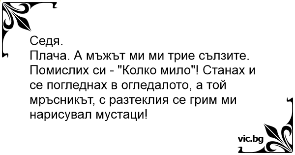 Плача. А мъжът ми ми трие сълзите. Помислих си - "Колко мило"! Станах и се погледнах в огледалото, а той мръсникът, с разтеклия се грим ми нарисувал мустаци!
