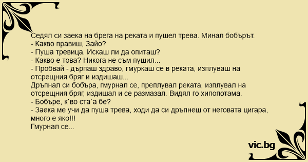 Седял си заека на брега на реката и пушел трева. Минал бобърът.