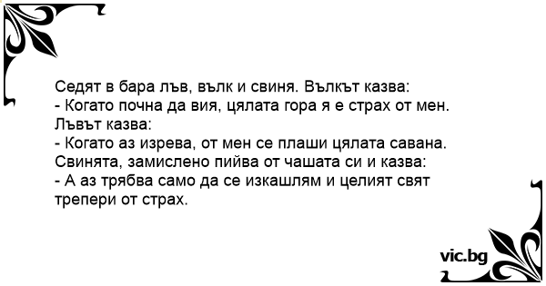 Седят в бара лъв, вълк и свиня. Вълкът казва:
