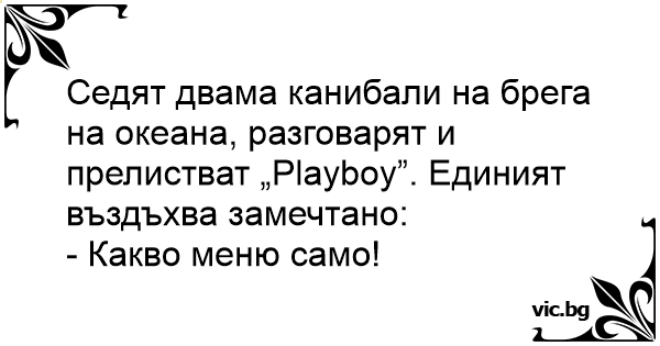 Седят двама канибали на брега на океана, разговарят и прелистват „Рlаyвоy”. Единият въздъхва замечтано: