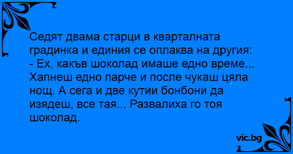 - Ех, какъв шоколад имаше едно време... Хапнеш едно парче и после чуkaш цяла нощ. А сега и две кутии бонбони да изядеш, все тая... Развалиха го тоя шоколад.